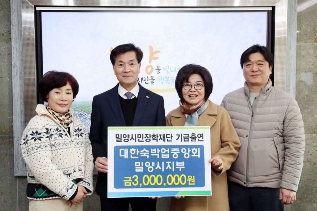 대한숙박업중앙회 밀양시지부는 각종 체육 대회 유치로 관내 숙박업이 활기를 띠게 되어 시에 감사한 마음을 전하고자 지난해 200만원 첫 기탁에 이어 올해도 장학기금을 기탁했다.