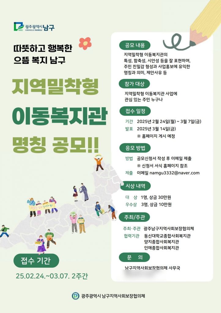 광주 남구지역사회보장협의체(민간위원장 이선미)는 '지역밀착형 이동복지관' 신규사업 시행에 앞서 남구만의 특성·사업성·함축성·시안성·가독성 등을 표현한 명칭 공모를 실시한다고 27일 밝혔다.