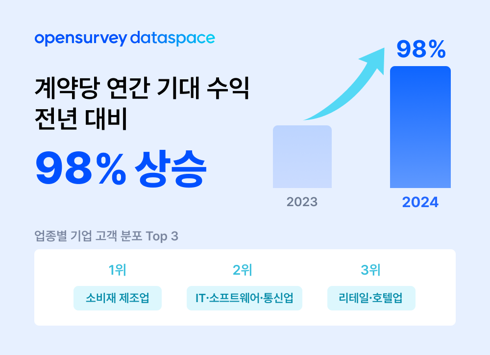 황희영 오픈서베이 대표는 "2024년 데이터스페이스의 성장은 기업들이 데이터 활용 역량 강화와 고객 경험 최적화에 대한 투자를 본격적으로 확대하고 있다는 점을 보여준다"며 "기업의 데이터 활용 니즈가 더욱 정교해지는 만큼 올해는 AI 기술 기반으로 직관적이면서도 고도화된 플랫폼을 만드는 데 집중해 지속적인 성장을 만들 계획"이라고 밝혔다.