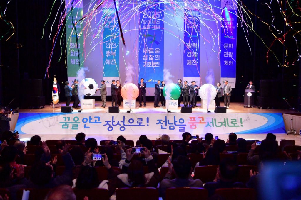 행사는 장성 청소년 뮤지컬동호회 ‘하랑’의 공연을 시작으로 체전 준비상황 보고 , 자원봉사자 위촉장 수여, 결의문 낭독 순으로 진행됐다. 이어 참석자들은 대형 공을 무대까지 굴리는 퍼포먼스를 통해 체전 성공을 기원했다. 공이 무대에 도착하자 ‘2025 양대체전 성공 기원! 새로운 성장의 기회로’라는 메시지가 공개됐고, 참가자들은 이를 함께 외치며 의지를 다졌다.