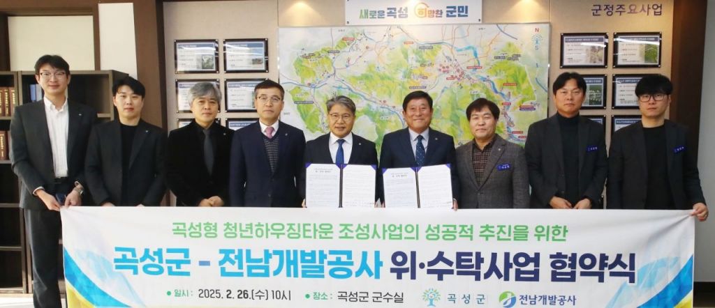 곡성군은 지난 26일 군청 회의실에서 전남개발공사와 ‘곡성형 청년하우징타운 조성사업’ 업무협약을 체결했다. 곡성군 제공