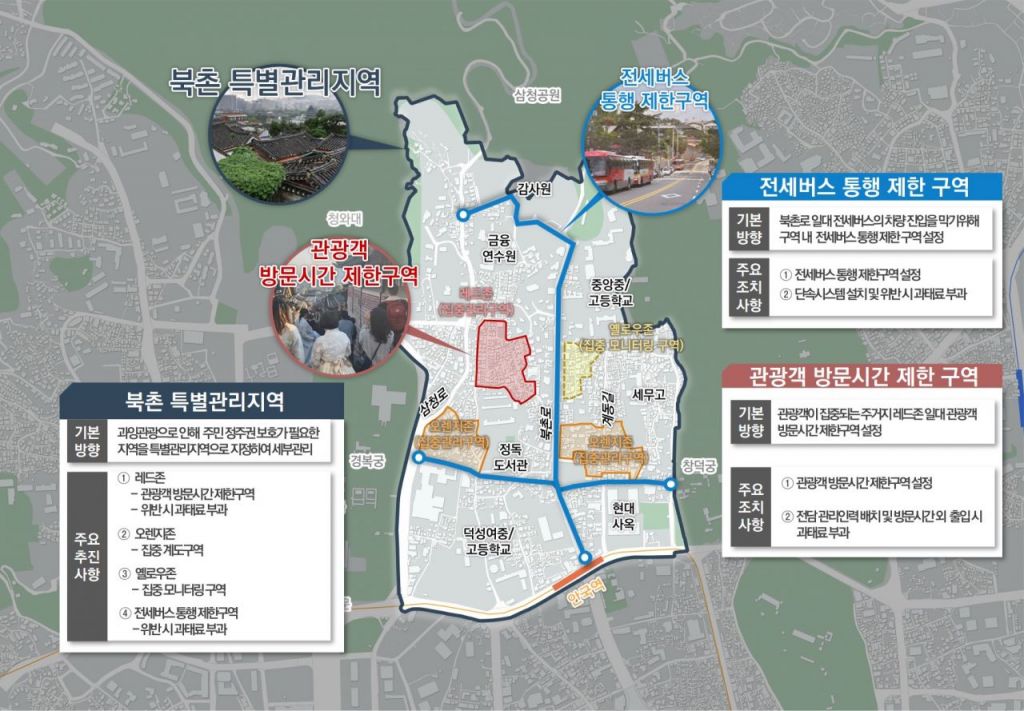 이외에도 종로구는 전세버스 불법 주정차 문제와 교통 혼잡 해소를 위해 내년 7월부터 과태료 유예기간을 거쳐 2026년 1월 ‘전세버스 통행 제한’을 시행한다. 대상지는 북촌로, 북촌로5길부터 창덕궁1길에 이르는 약 2.3km 구간이다. 통행 제한은 주말과 공휴일을 포함해 상시 적용되며 주민 편의를 위해 통근버스, 학교 버스, 마을버스 등은 허용한다.