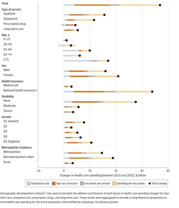 입원 치료, 외래 치료, 처방약 및 장기요양에 대한 의료비 지출 변화에서 각 요인의 추가 기여도 계산한 결과. 인구통계학적 분해 방법 25 사용. 고려대 제공