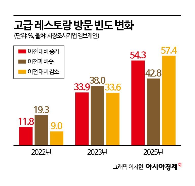 1일 시장조사전문기업 엠브레인이 최근 6개월 이내 외식 경험이 있는 만 19~59세 성인 남녀 1000명을 대상으로 진행한 '2025 고급 레스토랑 방문 및 RMR 관련 조사'에 따르면 응답자의 54.5%가 고급 레스토랑에 방문해본 경험이 있다고 답해 2022년(44.0%) 대비 10%포인트가량 늘어난 것으로 나타났다.