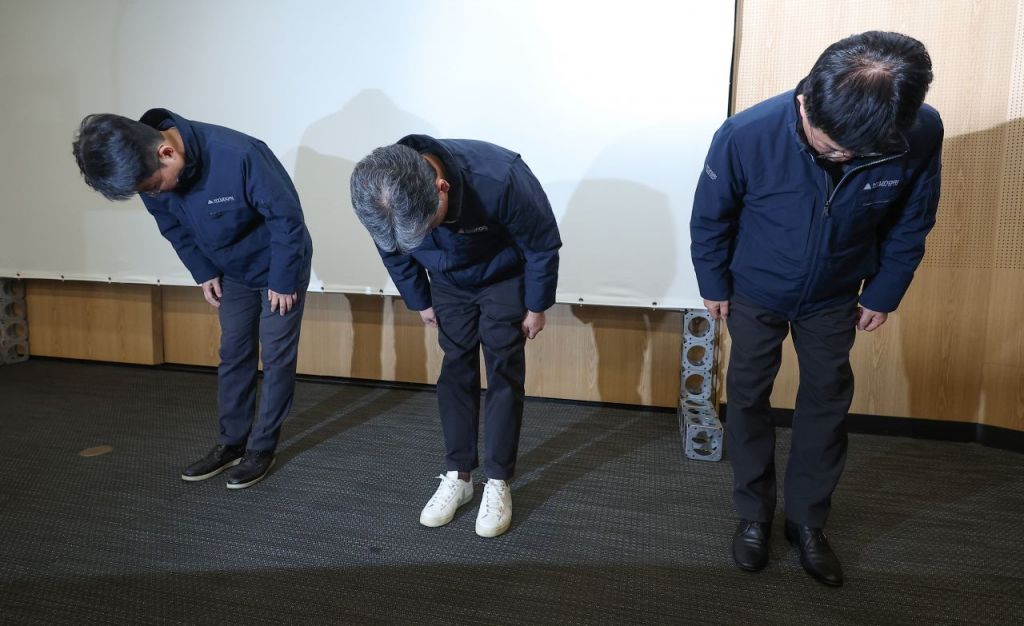 주우정 현대엔지니어링 대표이사(가운데)가 28일 서울 종로구 본사 빌딩에서 열린 서울세종 고속도로 사고 관련 간담회에서 사과하고 있다. 연합뉴스