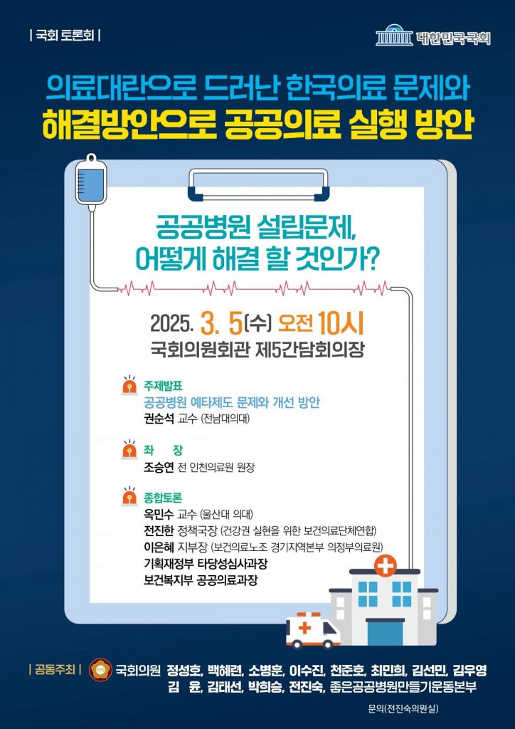 이번 토론회는 민주당 정성호·백혜련·소병훈·이수진·천준호·최민희·김우영·김윤·김태선·박희승 의원, 조국혁신당 김선민 대표 권한대행, 좋은공공병원만들기운동본부 등과 공동 주최한다.