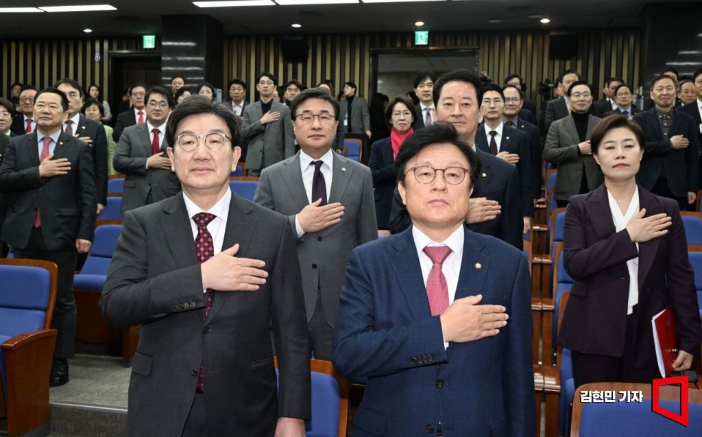 권성동 국민의힘 원내대표가 27일 국회에서 열린 의원총회에서 국민의례를 하고 있다. 2025.2.27 김현민 기자