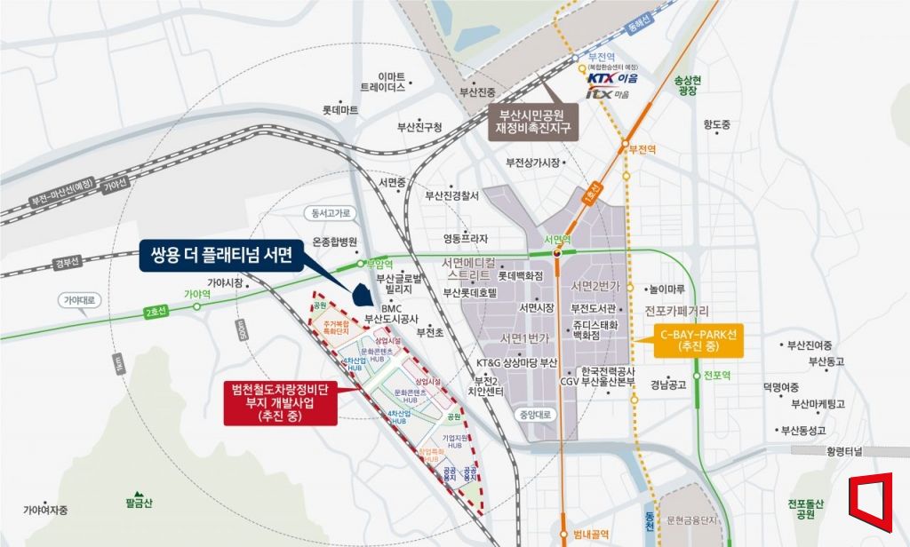 쌍용 더 플래티넘 서면은 범천철도차량정비단 부지 개발사업(예정)으로 인한 직접적 수혜를 누릴 수 있다. 범천철도차량정비단 부지는 4차산업과 문화콘텐츠 등이 융합된 ‘도심권혁신파크’로 바꾸고 일자리와 주거·문화·관광이 어우러진 국내 대표 4차산업 허브로 조성될 예정이다. 한국철도공사(코레일)는 개발 민간사업자 공모를 추진하고 있다.
