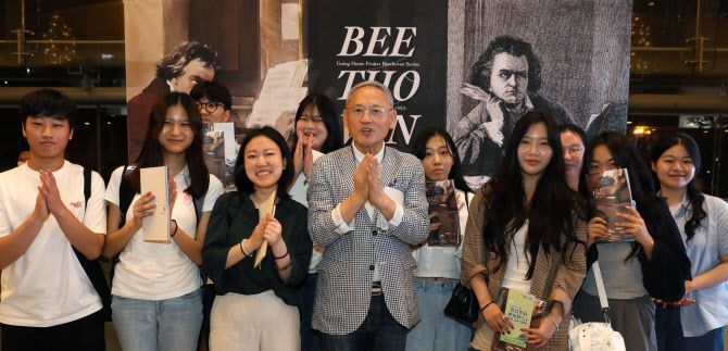 유인촌 문화체육관광부 장관이 지난해 7월17일 서울 서초구 예술의전당에서 청년문화예술패스 이용자들과 '고잉홈프로젝트 : 베토벤 전곡 시리즈2' 공연을 본 뒤 기념 촬영을 하고 있다. 문화체육관광부 제공
