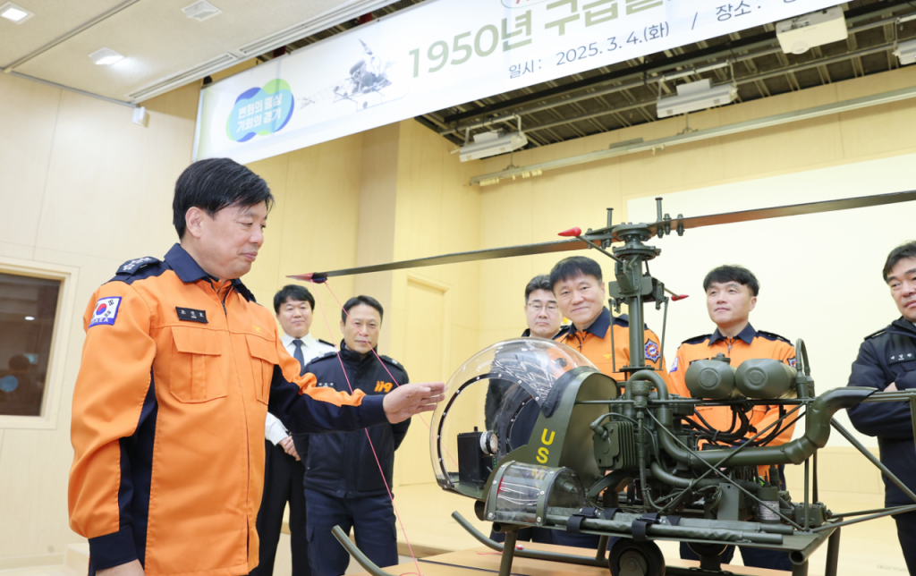 조선호 경기도소방재난본부장이 4일 대한민국 최초의 구급헬기인 'H-13수우' 재현 모델을 직원들과 함께 살펴보고 있다. 경기도소방재난본부 제공