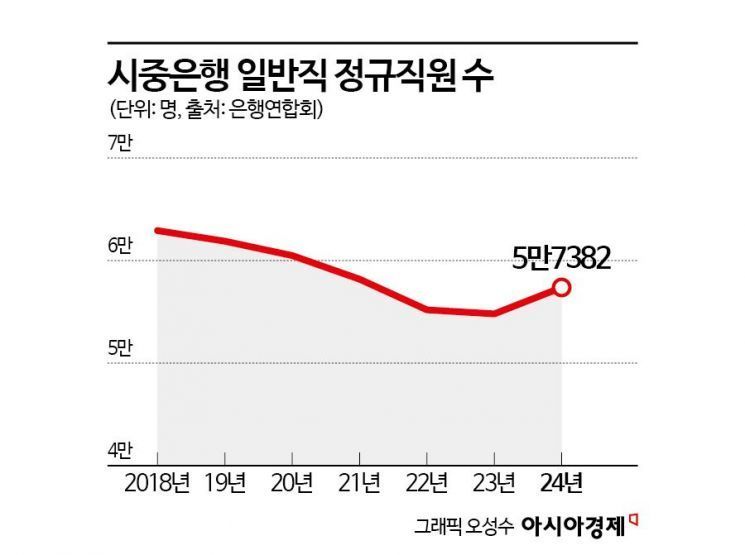 이에 올 상반기 5대 은행의 채용 규모는 500명을 밑돌 것으로 전망되면서, 연간 채용 규모 또한 예년 대비 줄어들 것으로 전망된다. 디지털 전환에 따른 점포 통폐합, 조직개편으로 인한 조직 슬림화 등의 영향으로 분석된다. 실제로 시중은행의 일반직 정규직원은 꾸준히 감소하는 추세다. 은행연합회에 따르면 시중은행의 일반직 정규직원은 2018년 6만2924명, 2019년 6만1892명, 2020년 6만492명, 2021년 5만8189명, 2022년 5만5198명, 2023년 5만4808명, 2024년 5만7382명으로 감소했다. 2024년에 시중은행 일반직 정규직원이 전년 대비 늘어난 것은 2023년 채용시장의 특수한 사례로, 당시 금융당국의 지시로 상생 금융의 일환으로 일시적으로 채용 규모를 늘렸던 영향으로 풀이된다.