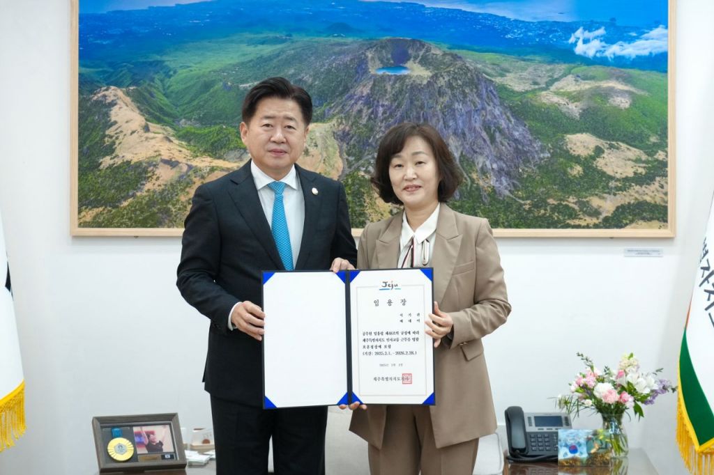 오영훈 지사는 이날 집무실에서 배태미 제주보훈청장에게 임용장을 수여했다.