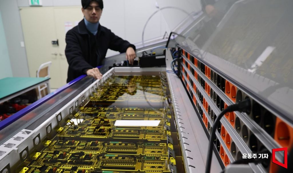 최우신 SKT AT 인프라 엔지니어링 팀 매니저가 아시아경제와의 인터뷰에서 액침냉감 시스템에 대해 설명하고 있다. 2025.02.19 윤동주 기자