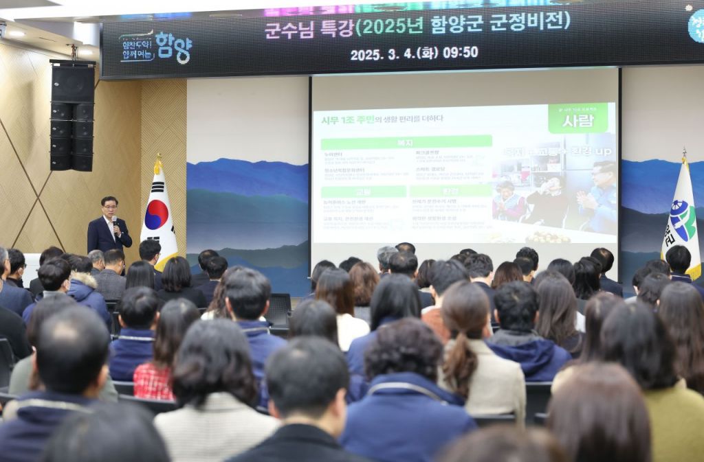 특강 순서에서는 진병영 군수가 직접 ‘2025년 함양군 군정 비전’을 직원들에게 설명하며 지난해 성과 및 반성, 올해 군정 방향 등을 공유하는 시간을 가졌다.
