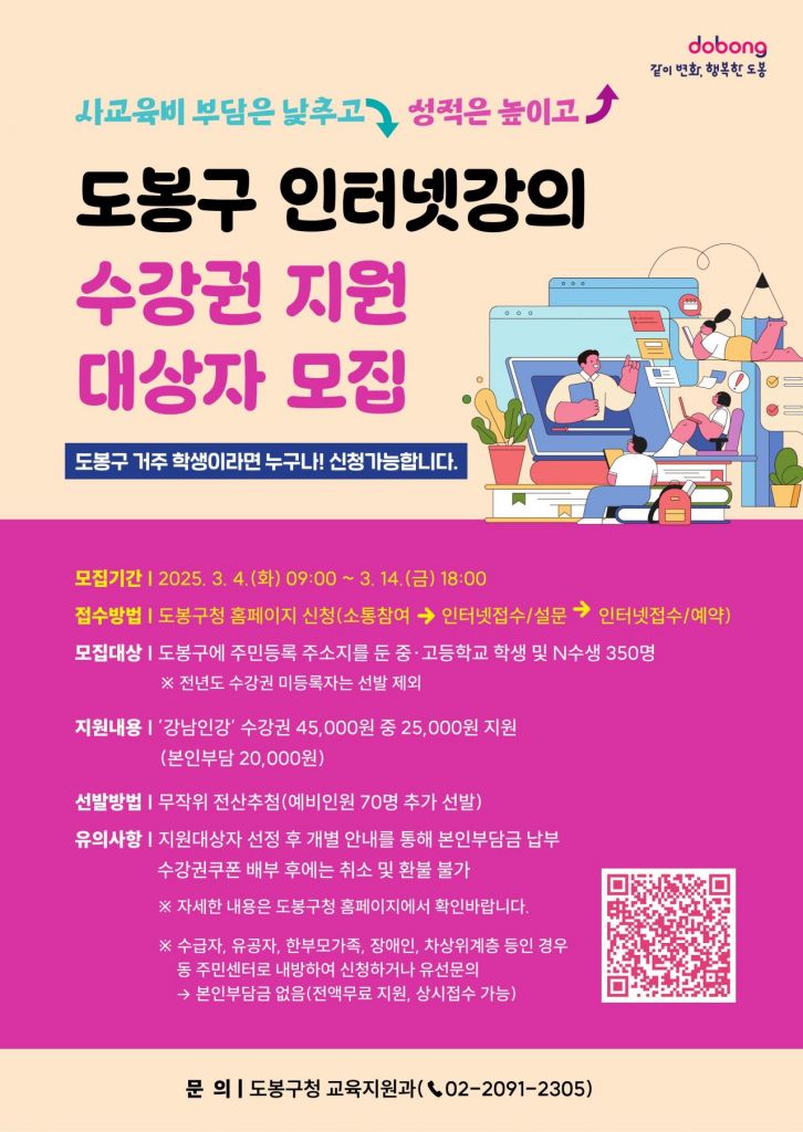 도봉구(구청장 오언석)가 인터넷 수능방송 ‘강남인강’ 수강권 지원 대상자를 모집한다.
