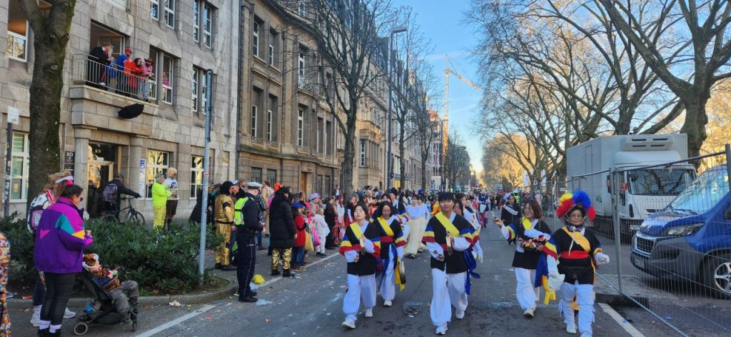 지난 3일 독일 뒤셀도르프 ’로젠몬탁‘ 카니발에서 민주·인권·평화통일 국제교류단에 참가한 광주학생들이 사물놀이를 공연하고 있다. 광주교육청 제공