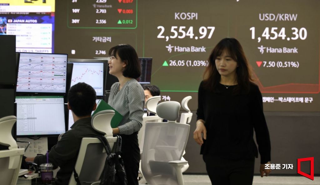 5일 서울 중구 하나은행 본점 딜링룸 현황판에 코스피 지수 등이 표시되고 있다. 이날 코스피는 전 거래일 대비 19.53포인트(0.77%) 오른 2,548.45에, 코스닥은 5.45포인트(0.74%) 오른 743.35, 원·달러 환율은 7.8원 내린 1454.0에 개장했다.