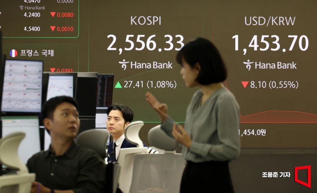 5일 서울 중구 하나은행 본점 딜링룸 현황판에 코스피 지수 등이 표시되고 있다. 이날 코스피는 전 거래일 대비 19.53포인트(0.77%) 오른 2,548.45에, 코스닥은 5.45포인트(0.74%) 오른 743.35, 원·달러 환율은 7.8원 내린 1454.0에 개장했다.