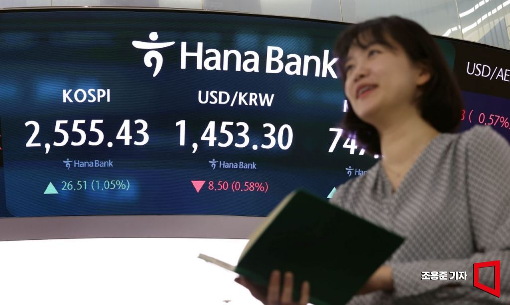 5일 서울 중구 하나은행 본점 딜링룸 현황판에 코스피 지수 등이 표시되고 있다. 이날 코스피는 전 거래일 대비 19.53포인트(0.77%) 오른 2,548.45에, 코스닥은 5.45포인트(0.74%) 오른 743.35, 원·달러 환율은 7.8원 내린 1454.0에 개장했다.