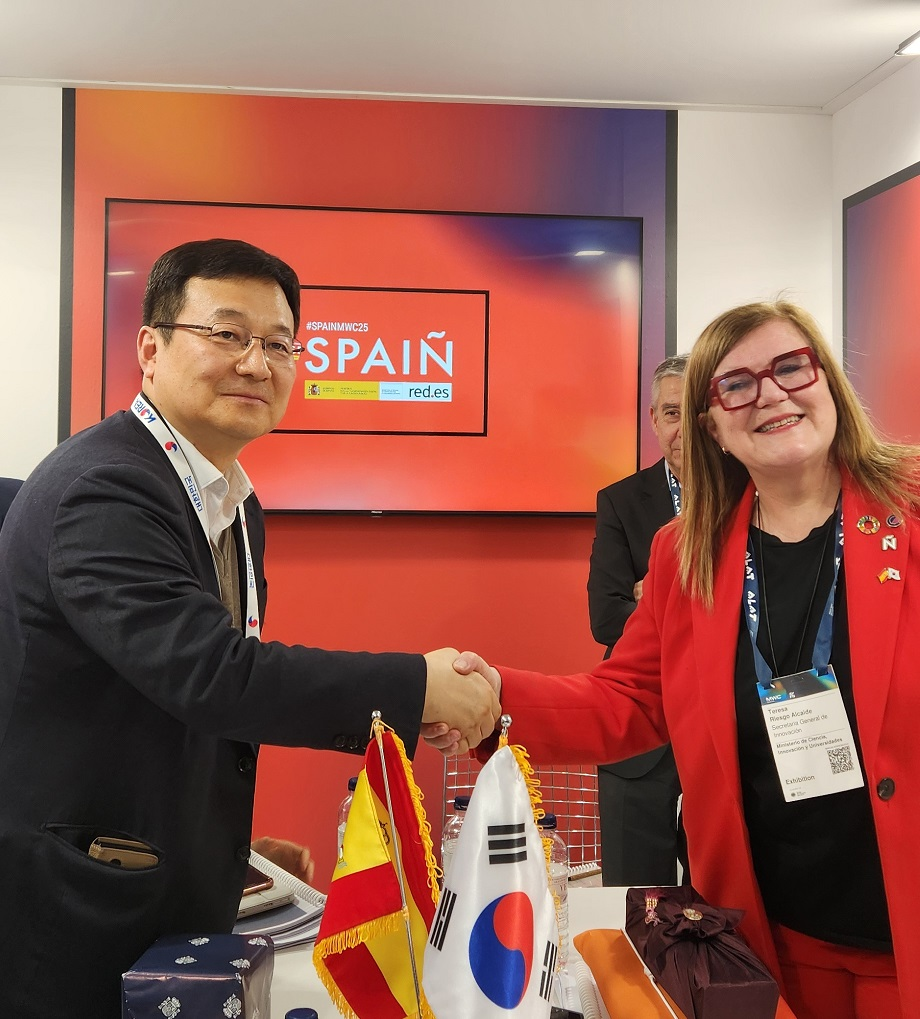 황성훈 과학기술정보통신부 국제협력관과 테레사 리에고 알카이드 스페인 과학혁신대학부 차관보가 4일(현지시간) 바르셀로나에서 열린 제2차 한-스페인 과학기술공동위원회에서 악수하고 있다. 과기정통부 제공