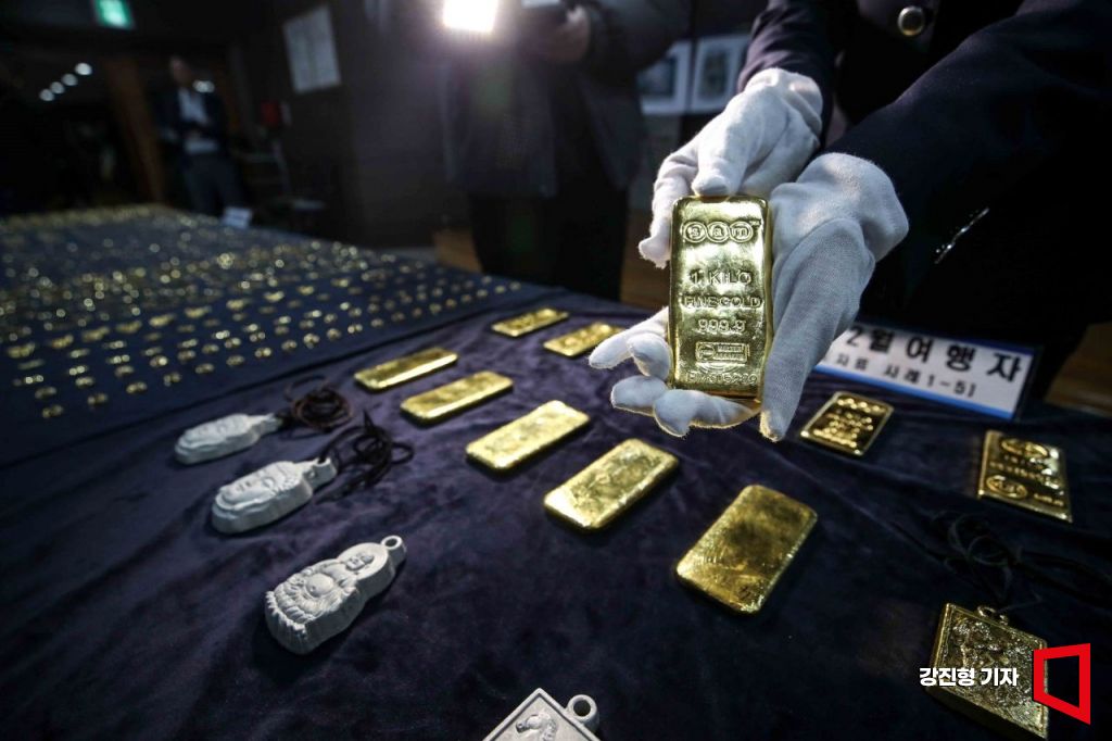5일 인천공항세관 수출입통관청사에서 직원이 금 밀수품을 공개하고 있다.