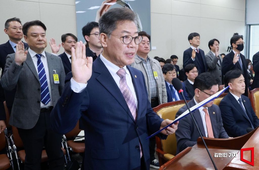 김용빈 중앙선거관리위원회 사무총장이 5일 국회에서 열린 과학기술정보방송통신위원회 전체회의에 출석해 현안 질의에 앞서 증인 선서를 하고 있다.