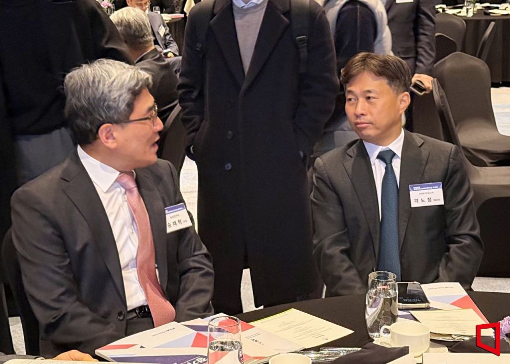 왼쪽부터 송재혁 삼성전자 DS(디바이스솔루션) 부문 최고기술책임자(CTO)와 곽노정 SK하이닉스 사장이 5일 오전 경기 성남시 더블트리바이힐튼 판교에서 열린 '2025년도 한국반도체산업협회·연구조합 정기총회'에서 대화를 나누고 있다. 장희준 기자