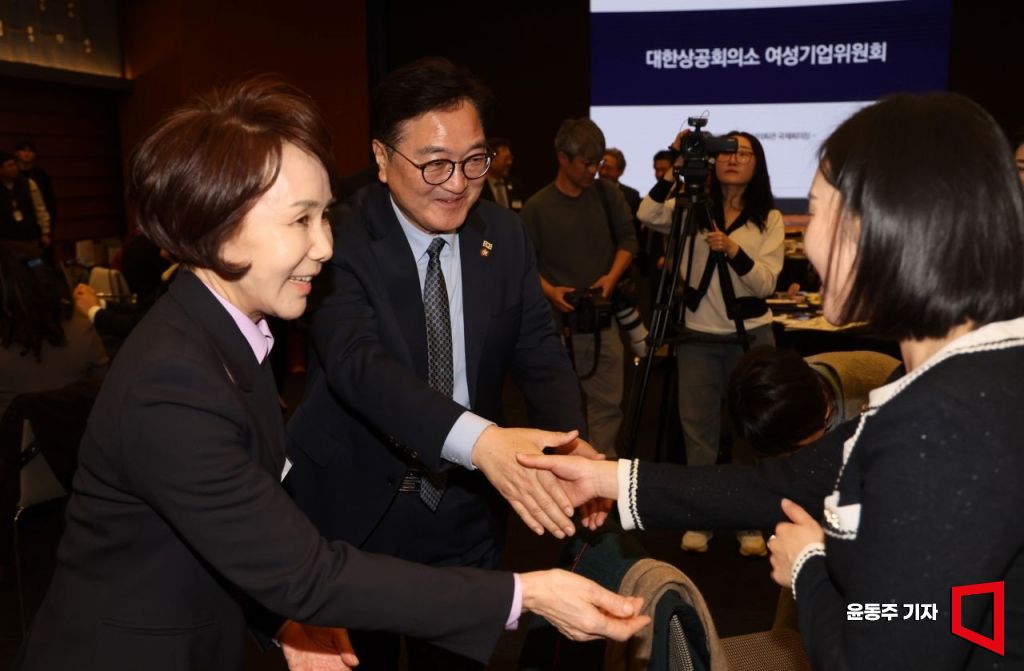 우원식 국회의장이 5일 서울 중구 대한상공회의소에서 열린 '여성기업위원회' 창립 총회에 참석해 여성 기업인들과 인사를 나누고 있다. 대한상의 여성기업위원회는 중견·중소기업부터 스타트업까지 각 분야 최고의 여성 최고경영자(CEO) 50인으로 구성해 여성 기업인들의 소통창구 마련과 활발한 경제활동을 지원할 예정이다.