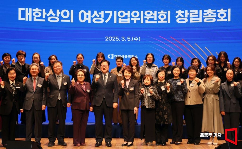 5일 서울 중구 대한상공회의소에서 '여성기업위원회' 창립 총회가 열렸다. 총회에 참석한 우원식 국회의장과 초대 위원장으로 선출된 정기옥 LSC 푸드 회장, 박일준 대한상의 상근부회장 등 참석자들이 기념사진을 찍고 있다. 대한상의 여성기업위원회는 중견·중소기업부터 스타트업까지 각 분야 최고의 여성 최고경영자(CEO) 50인으로 구성해 여성 기업인들의 소통창구 마련과 활발한 경제활동을 지원할 예정이다.