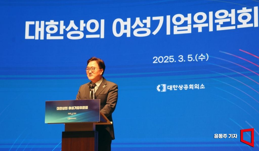 우원식 국회의장이 5일 서울 중구 대한상공회의소에서 열린 '여성기업위원회' 창립 총회에 참석해 축사를 하고 있다. 대한상의 여성기업위원회는 중견·중소기업부터 스타트업까지 각 분야 최고의 여성 최고경영자(CEO) 50인으로 구성해 여성 기업인들의 소통창구 마련과 활발한 경제활동을 지원할 예정이다.