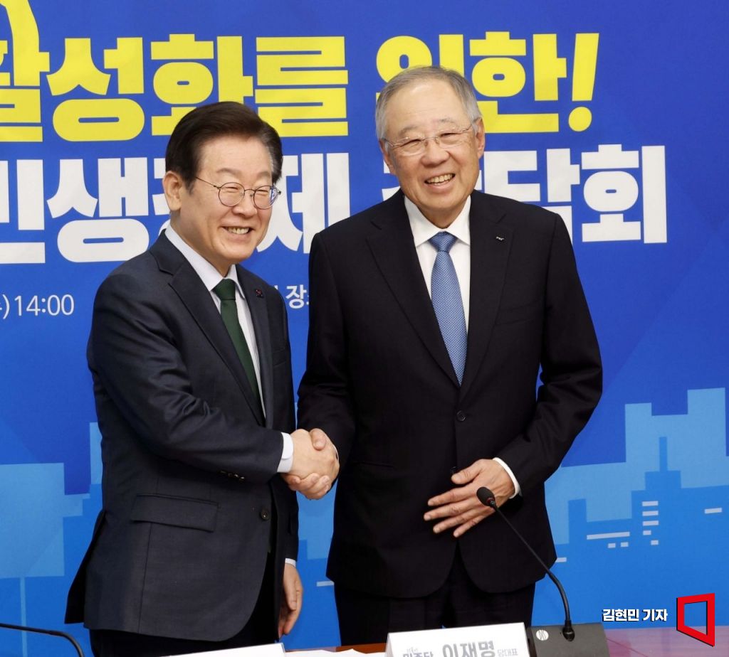 이재명 더불어민주당 대표와 류진 한국경제인협회 회장이 5일 국회에서 열린 '더불어민주당-한국경제인협회 민생경제 간담회'에서 악수를 하고 있다.