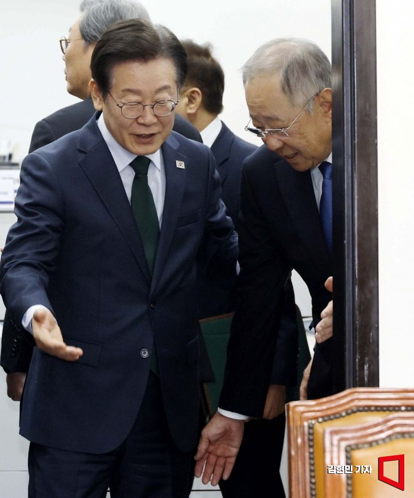 이재명 더불어민주당 대표와 류진 한국경제인협회 회장이 5일 국회에서 열린 '더불어민주당-한국경제인협회 민생경제 간담회'에 참석하고 있다.
