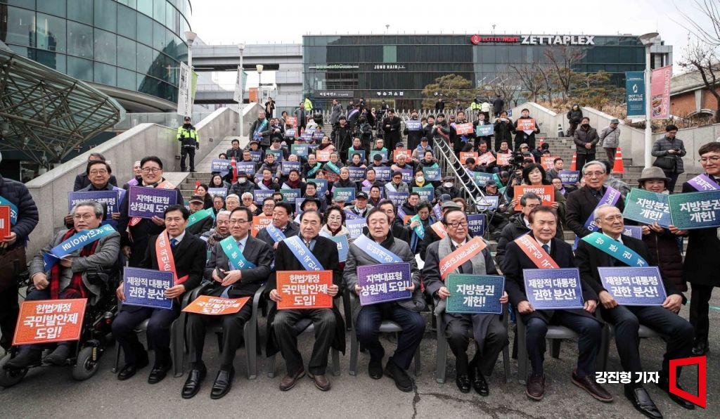 5일 서울 중구 서울역 광장에서 대한민국헌정회 소속 관계자들이 헌법개정 범국민 결의대회 및 서명운동 발대식에 참석해 제왕적 대통령 권한 분산을 촉구하고 있다.