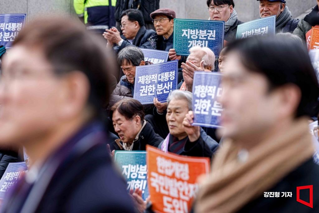 5일 서울 중구 서울역 광장에서 대한민국헌정회 소속 관계자들이 헌법개정 범국민 결의대회 및 서명운동 발대식에 참석해 제왕적 대통령 권한 분산을 촉구하고 있다.