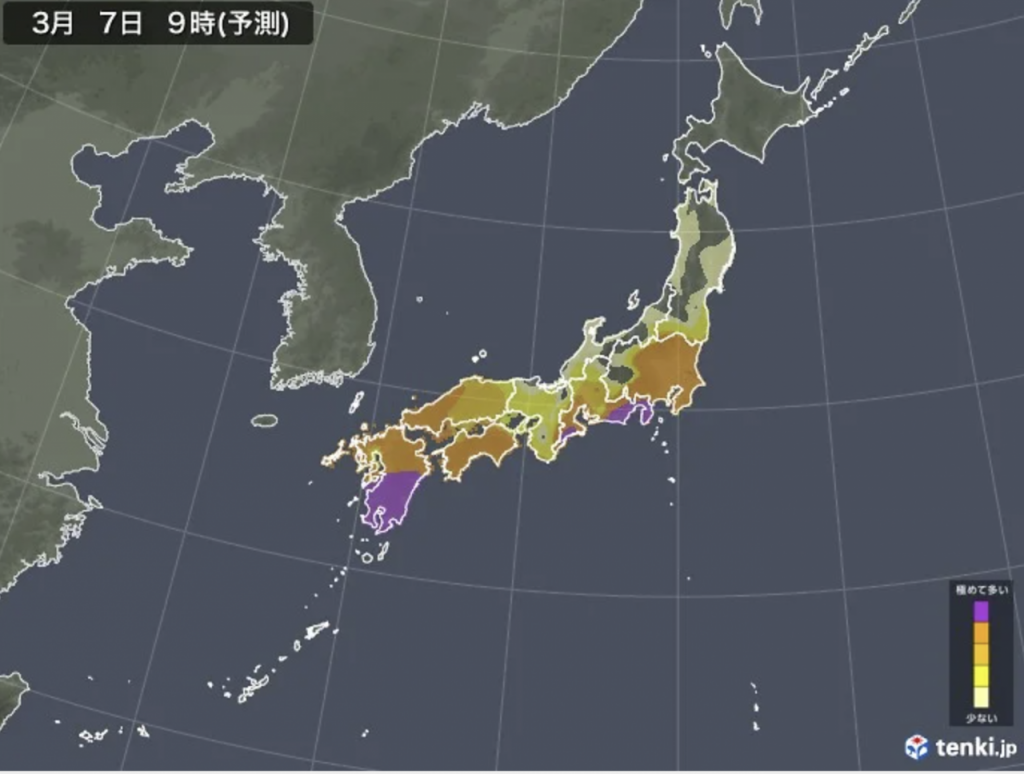 일본 기상청의 꽃가루 지도. 짙은 색일수록 양이 많다. 텡키재팬.