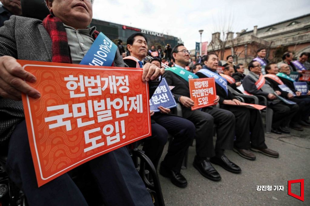 5일 서울 중구 서울역 광장에서 대한민국헌정회 소속 관계자들이 헌법개정 범국민 결의대회 및 서명운동 발대식에 참석해 제왕적 대통령 권한 분산을 촉구하고 있다.