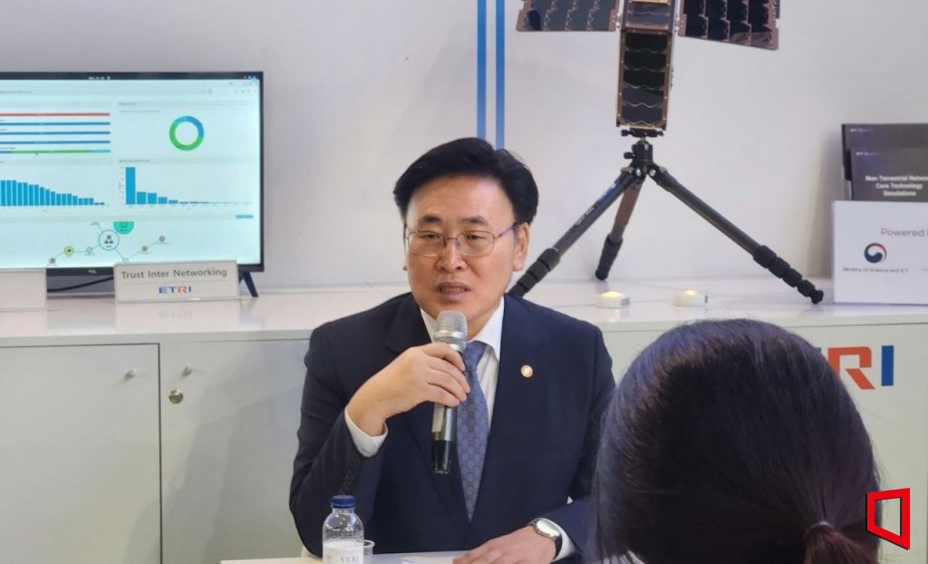 유상임 과기정통부 장관이 5일(현지시간) 스페인 바르셀로나 MWC2025에서 열린 기자간담회에서 말하고 있다. 사진=박유진 기자