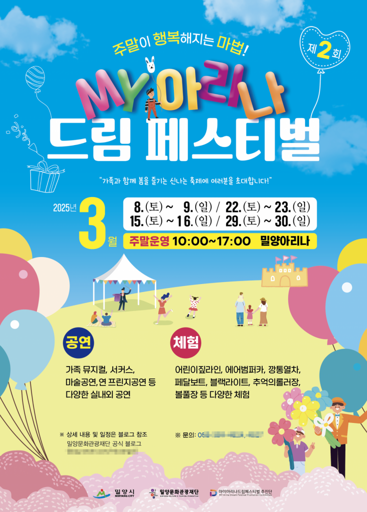 경남 밀양시는 오는 8일부터 30일까지 밀양아리나에서 온 가족이 함께 공연과 체험을 즐길 수 있는 제2회 MY아리나 드림 페스티벌을 개최한다.