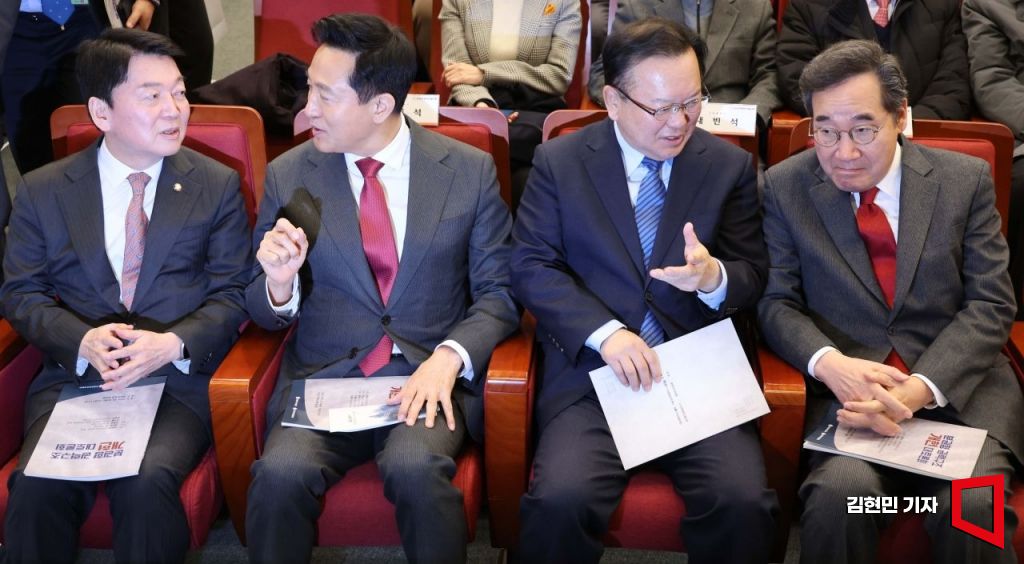 6일 국회도서관에서 열린 '분권형 권력구조 개헌 대토론회'에 안철수 국민의힘 의원(왼쪽부터), 오세훈 서울시장, 김부겸 전 국무총리, 이낙연 전 국무총리가 참석해 있다.