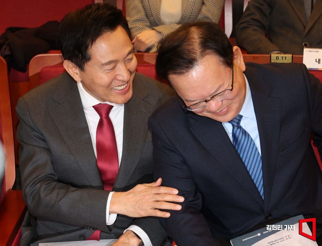 오세훈 서울시장과 김부겸 전 국무총리가 6일 국회도서관에서 열린 '분권형 권력구조 개헌 대토론회'에서 대화하고 있다.