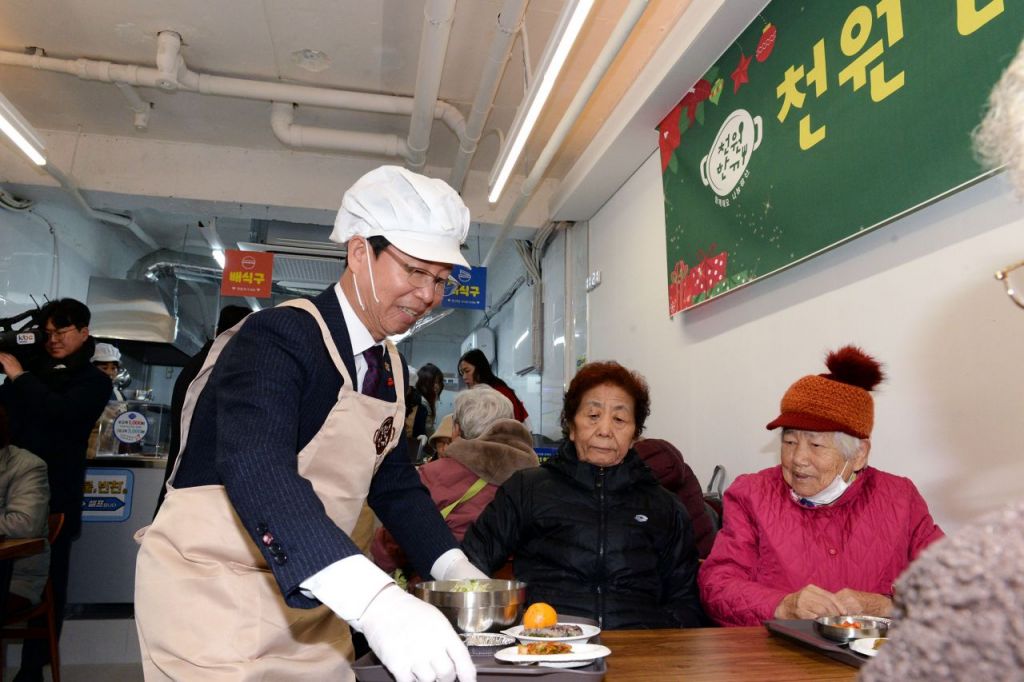 박병규 광주 광산구청장이 지난해 12월 24일 광주 광산구 첨단2동에 위치한 ‘천원한끼 첨단점’에서 어르신들에게 직접 식사를 나르고 있다. 광주 광산구 제공