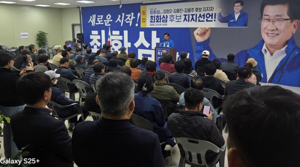전남 담양군수 재선거 더불어민주당 후보 경선 과정에서 김정오 예비후보를 지지했던 지지자들이 6일 최화삼 후보 선거사무실을 찾아 ‘최 후보 지지’를 선언했다.