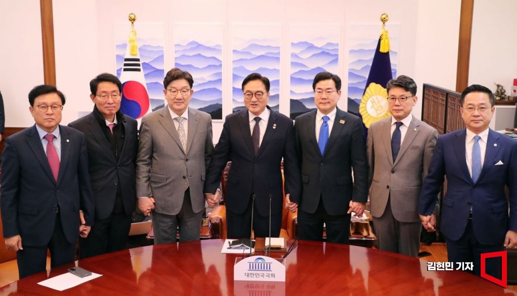 6일 국회에서 열린 여·야 국정협의회에서 참석자들이 손을 맞잡고 있다. 왼쪽부터 국민의힘 박형수 원내수석부대표, 김상훈 정책위의장, 권성동 원내대표, 우원식 국회의장, 더불어민주당 박찬대 원내대표, 진성준 정책위의장, 박성준 원내수석부대표. 2025.3.6 김현민 기자