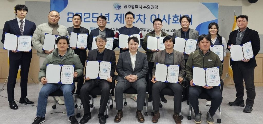 지난 5일 광주시체육회에서 열린 광주수영연맹 ‘2025년 제2차 이사회’에서 임명된 통합 제3대 임원들이 기념 촬영을 하고 있다. 광주수영연맹 제공