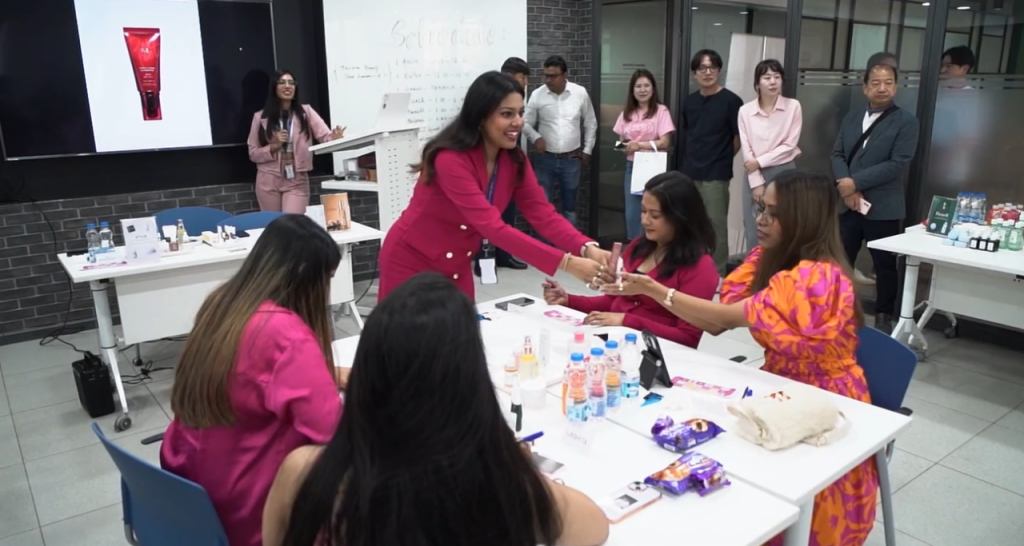 블리몽키즈가 반기마다 1회씩 운영하는 ‘마카롱 뷰티 클래스’에서 인도 현지 인플루언서와 뷰티 아티스트들이 K뷰티 트렌드에 맞춘 화장법과 노하우를 배우고 있다. 블리몽키즈 제공