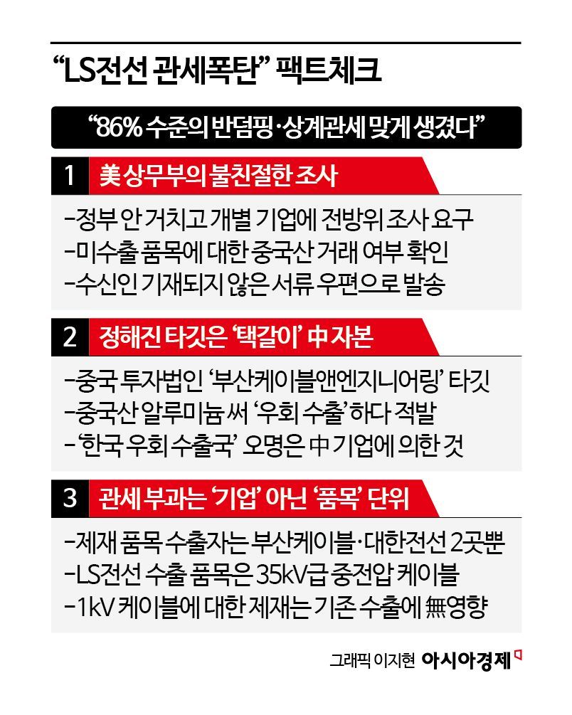 ◆다짜고짜 '수신인 없는' 공문 날린 美 상무부= LS전선이 '관세 폭탄'을 맞게 됐다는 오해가 퍼진 배경에는 3가지 특이점이 있다. 먼저 외교 관례상 미 상무부의 카운터파트는 산업통상자원부다. 우리 기업들 전반에 대한 요구사항이 있다면 산업부를 통해 일괄적인 요청을 넘기는 게 합리적이다. 그러나 상무부는 이례적으로 개별 기업들에 직접 서류를 발송했다. 더구나 일부 기업들에 발송된 서류에는 수신인이 기재되지 않는 등 기업들의 대응을 어렵게 만들었다.