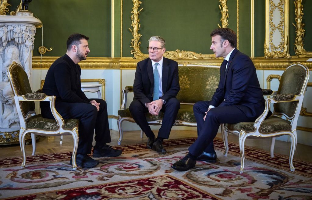 지난 2일 런던에서 왼쪽부터 볼로디미르 젤렌스키 우크라이나 대통령, 키어 스타머 영국 총리, 에마뉘엘 마크롱 프랑스 대통령이 회동하는 모습. UPI연합뉴스