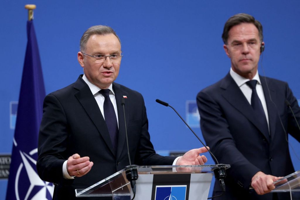 안제이 두다 폴란드 대통령(왼쪽)과 마르크 뤼터 나토 사무총장이 6일(현지시간) 벨기에 브뤼셀 나토 본부에서 열린 기자회견에 참석했다. 로이터연합뉴스