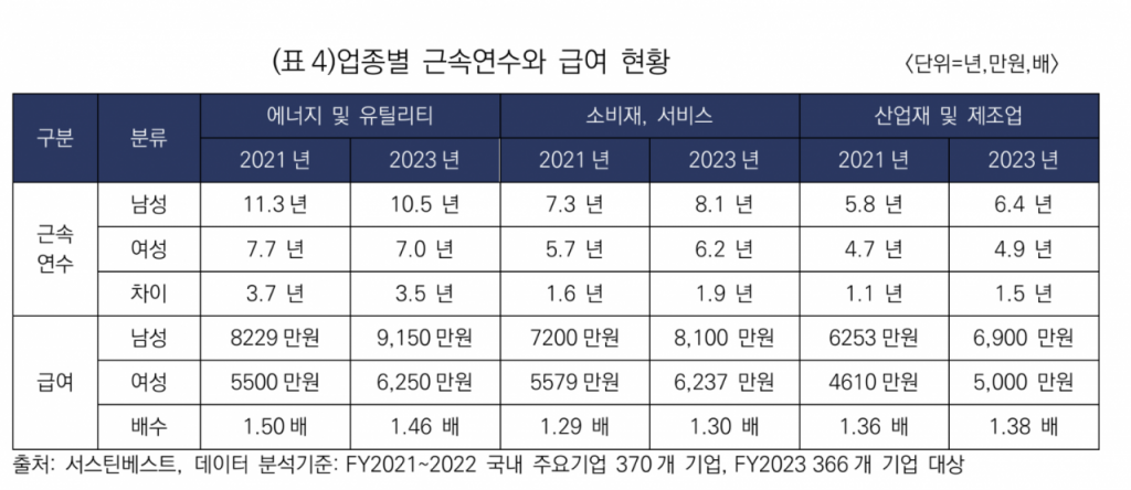 업종별로 근속연수와 급여 배수를 비교해서 보면 ‘산업재 및 제조업’의 경우 여성의 근속연수가 4.9년으로 남성과 1.5년 정도 밖에 차이가 나지 않는데 급여는 남성이 38% 높았다. ‘소비재 서비스’ 업종의 경우도 남녀 간 근속연수 차이는 1.9년인데 급여는 30%가량 차이가 났다.