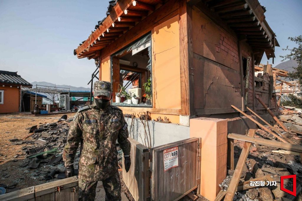 포천 승진훈련장에서 열린 한미연합훈련 중 포탄이 민가에 떨어져 인명 피해가 발생한 가운데 7일 경기 포천 이동면 노곡리 민가가 오인 폭격으로 파손돼 있다.